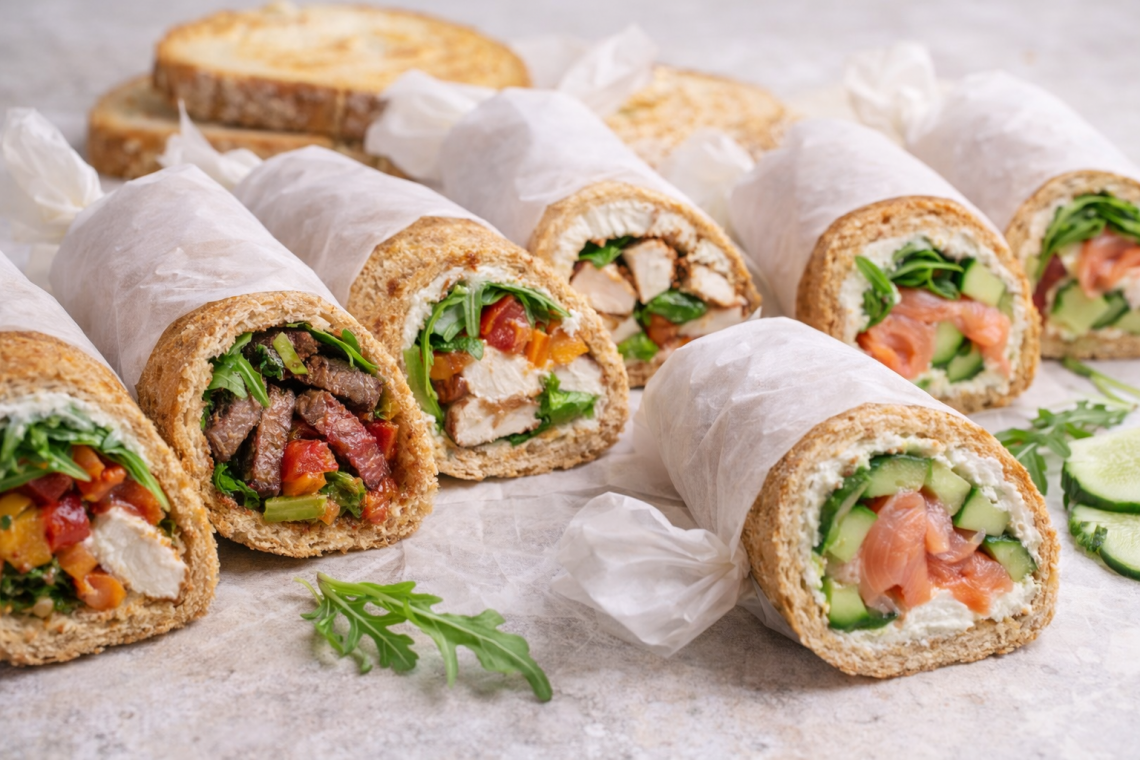 Toastscheiben auf eine Stück Butterbrotpapier legen und aufrollen. Die Enden wie ein Bonbon zusammendrehen. Anschließen für ca. 1 Stunde in den Kühlschrank stellen. Zum Servieren: Papier entfernen und die Sandwichrollen diagonal teilen.