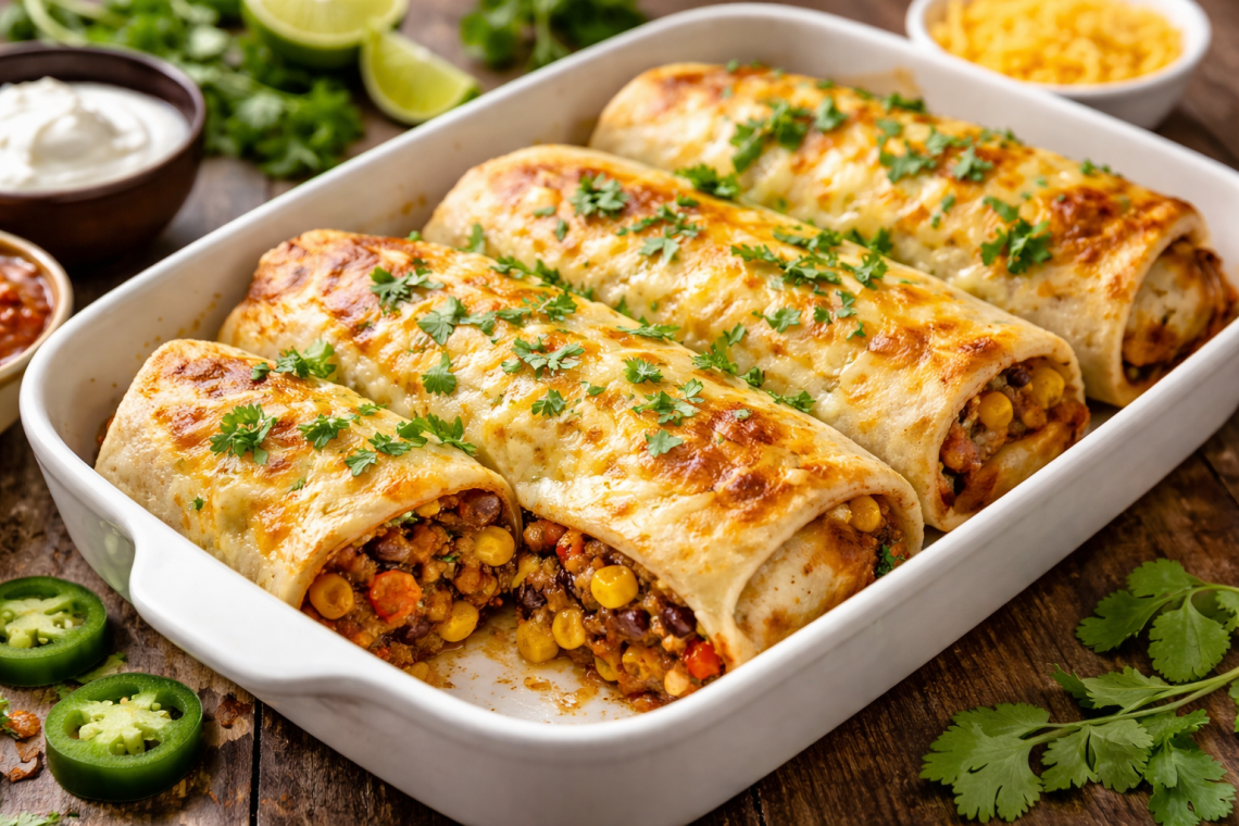 Zwiebeln schälen und würfeln. Paprika waschen, entkernen und in kleine Stücke schneiden. Olivenöl in der Pfanne erhitzen und das Hackfleisch darin scharf anbraten. Zwiebeln und Paprika zugeben und etwa 5 Minuten garen, bis das Hackfleisch durchgebraten ist. Mit Salz, Pfeffer, Cayennepfeffer und Kreuzkümmel kräftig würzen. Das Tomatenmark zugeben, kurz mitrösten, dann die stückigen Tomaten mit dem Saft und den abgetropften Mais unterrühren. Die Masse einige Minuten einkochen lassen, bis fast die ganze Flüssigkeit verdampft ist. Mit den Gewürzen und etwas Zucker abschmecken. Die Tortillas mit Creme fraiche bestreichen und die Hackfleischmasse gleichmäßig darauf verteilen. Mit etwas geriebenem Käse bestreuen. Die Tortillas zu Burritos aufrollen und in eine Auflaufform legen. Mit dem restlichen Käse bestreuen und im auf 200 ° vorgeheizten Backofen 4 – 5 Minuten überbacken, bis der Käse verlaufen ist. Sofort servieren.