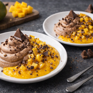 Toblerone Mousse mit fruchtigem Mangopüree.