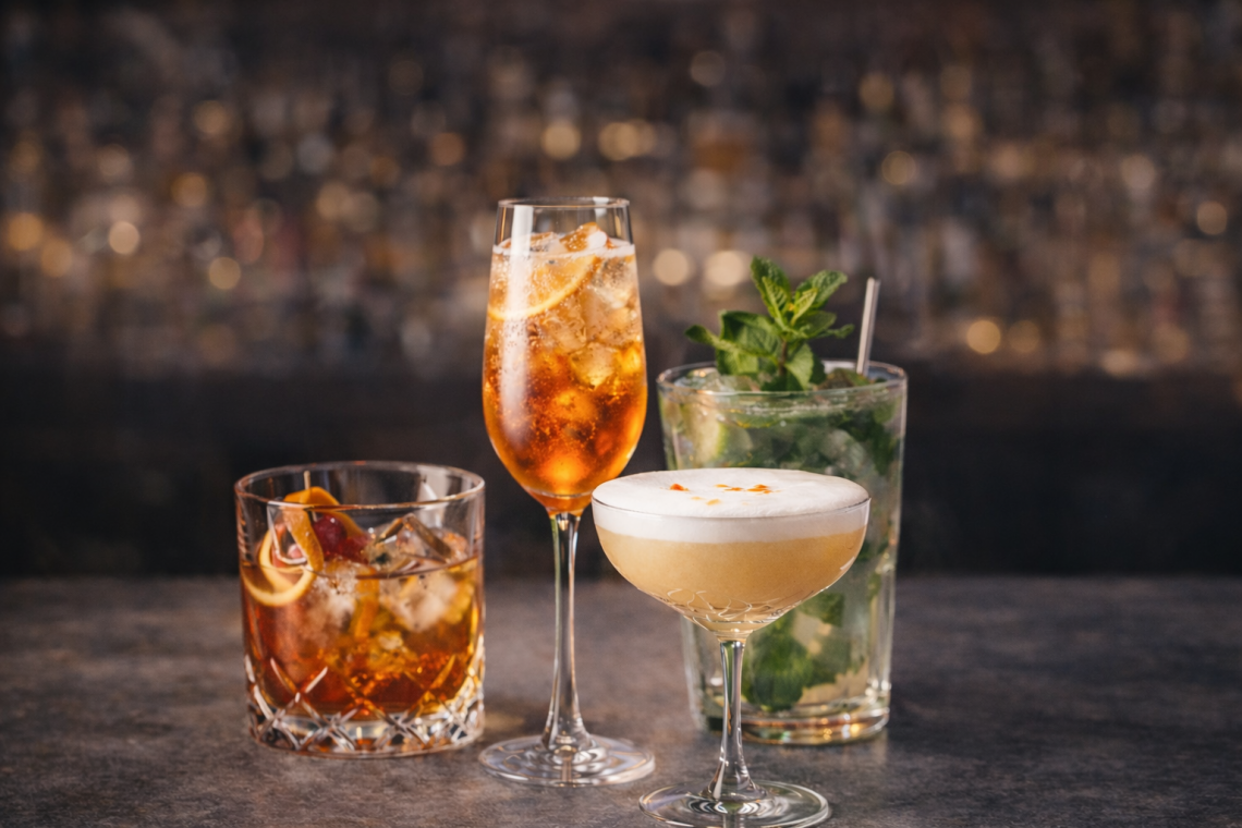 Fotorealistisches Bild eines Mojito-Cocktails mit Eiswürfeln, Limettenscheiben und frischer Minze in einem hohen Glas, serviert auf heller Oberfläche mit unscharfem Barhintergrund.