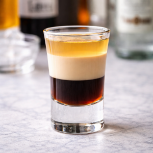 Alle Zutaten langsam über den Rücken eines Kaffeelöffels ins Glas gießen. Wenn man langsam gießt, vermischen sich die Zutaten nicht und es entstehen 3 Schichten.