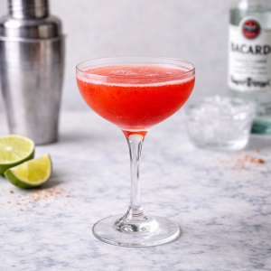 Fotorealistisches Bild eines cremigen Alexander-Cocktails in einer Cocktailschale, bestäubt mit frisch geriebener Muskatnuss, serviert auf heller Oberfläche mit Barzubehör im unscharfen Hintergrund.