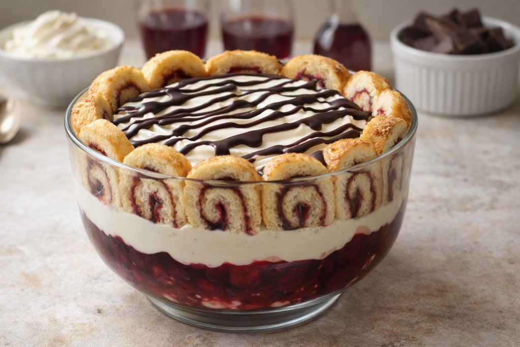 Desserttraum mit Sauerkirschen, Schokoladensahne und Quark-Mascarponecreme. Read more