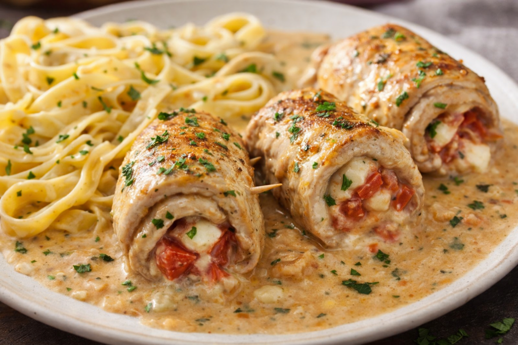 Putenrouladen, gefüllt mit Tomate und Mozzarella. Read more