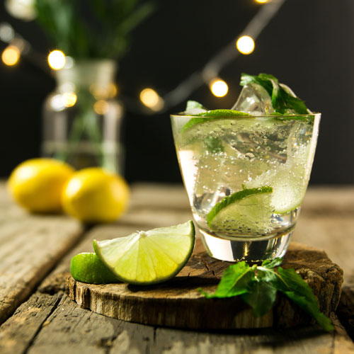 Mit Sprudelwasser auffüllen und mit Minze garnieren.