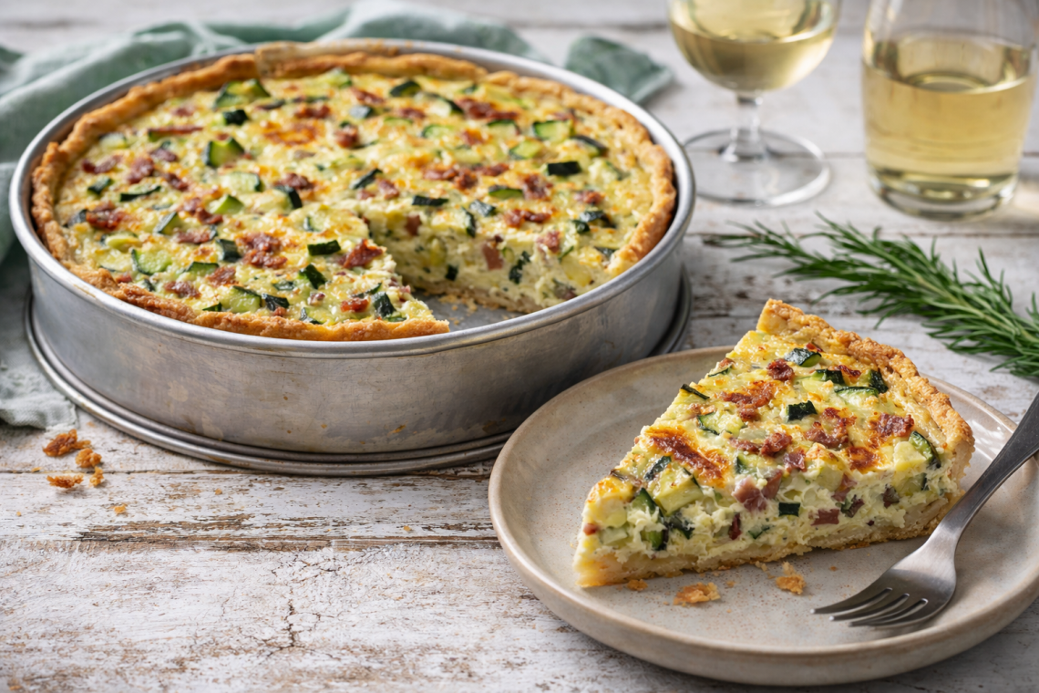 Diese pikante Zucchinitorte ist ein echter Klassiker aus der herzhaften Küche: buttriger Mürbeteig, würziger Speck, saftige Zucchini und eine cremige Füllung, die im Ofen goldbraun wird. Ideal als Hauptgericht, für ein Buffet oder als rustikales Abendessen mit einem Glas Weißwein.